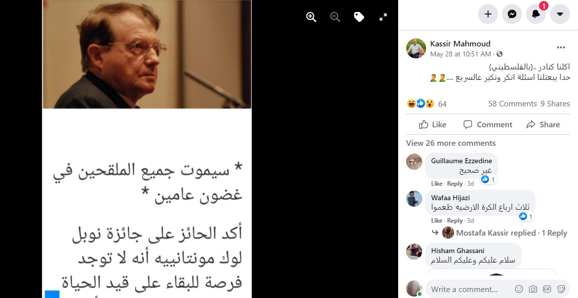 وقد أرفق المنشور برابط يقود الى مقالة نشرها موقع life site news، في 19 ايار 2021، بعنوان: Nobel Prize winner: Mass COVID vaccination an ‘unacceptable mistake’، أي الفائز بجائزة نوبل: التطعيم الجماعي ضد فيروس كورونا "خطأ غير مقبول"، وذلك كدليل على الكلام المتناقل المنسوب لمونتانييه.