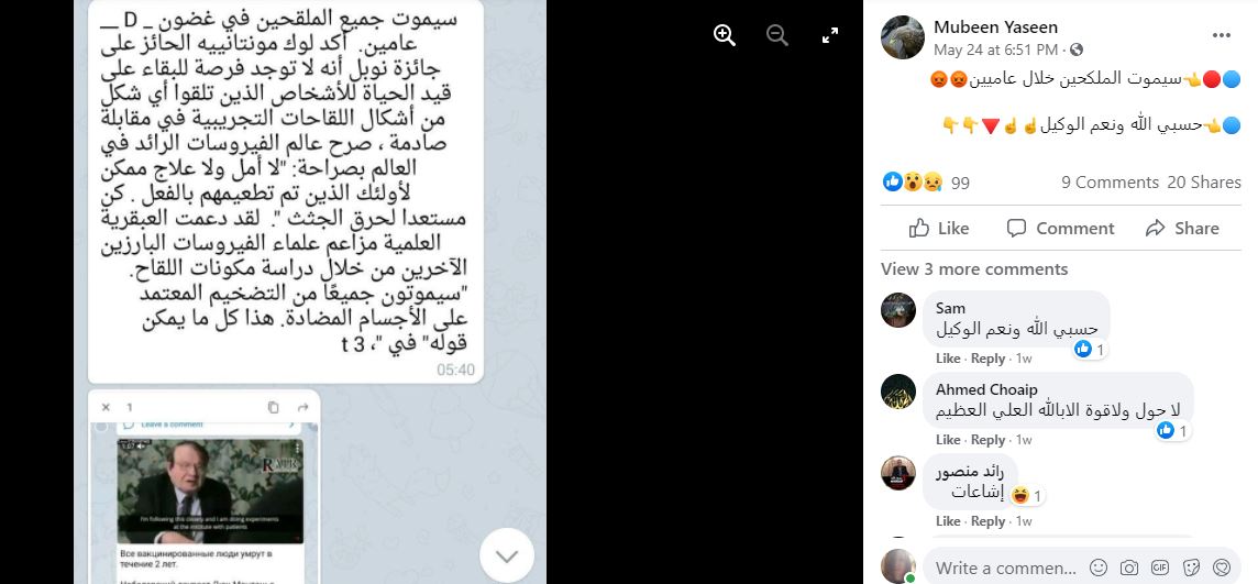 الوقائع: التشارك في المنشور تكثّف أخيرا، عبر صفحات وحسابات، في الفايسبوك (هنا، هنا، هنا، هنا، هنا، هنا...)، وتويتر (هنا، هنا، هنا...)، وايضا عبر الواتساب، وفي هذين الموقعين الاخباريين (هنا، وهنا). وقد جاء في نصه (من دون تدخل أو تصحيح): "أكد الحائز على جائزة نوبل لوك مونتانييه أنه لا توجد فرصة للبقاء على قيد الحياة للأشخاص الذين تلقوا أي شكل من أشكال اللقاح. في المقابلة المروعة، صرح كبير علماء الفيروسات في العالم بصراحة: "لا أمل ولا علاج ممكن لأولئك الذين تم تطعيمهم بالفعل. يجب أن نكون مستعدين لحرق الجثث".
