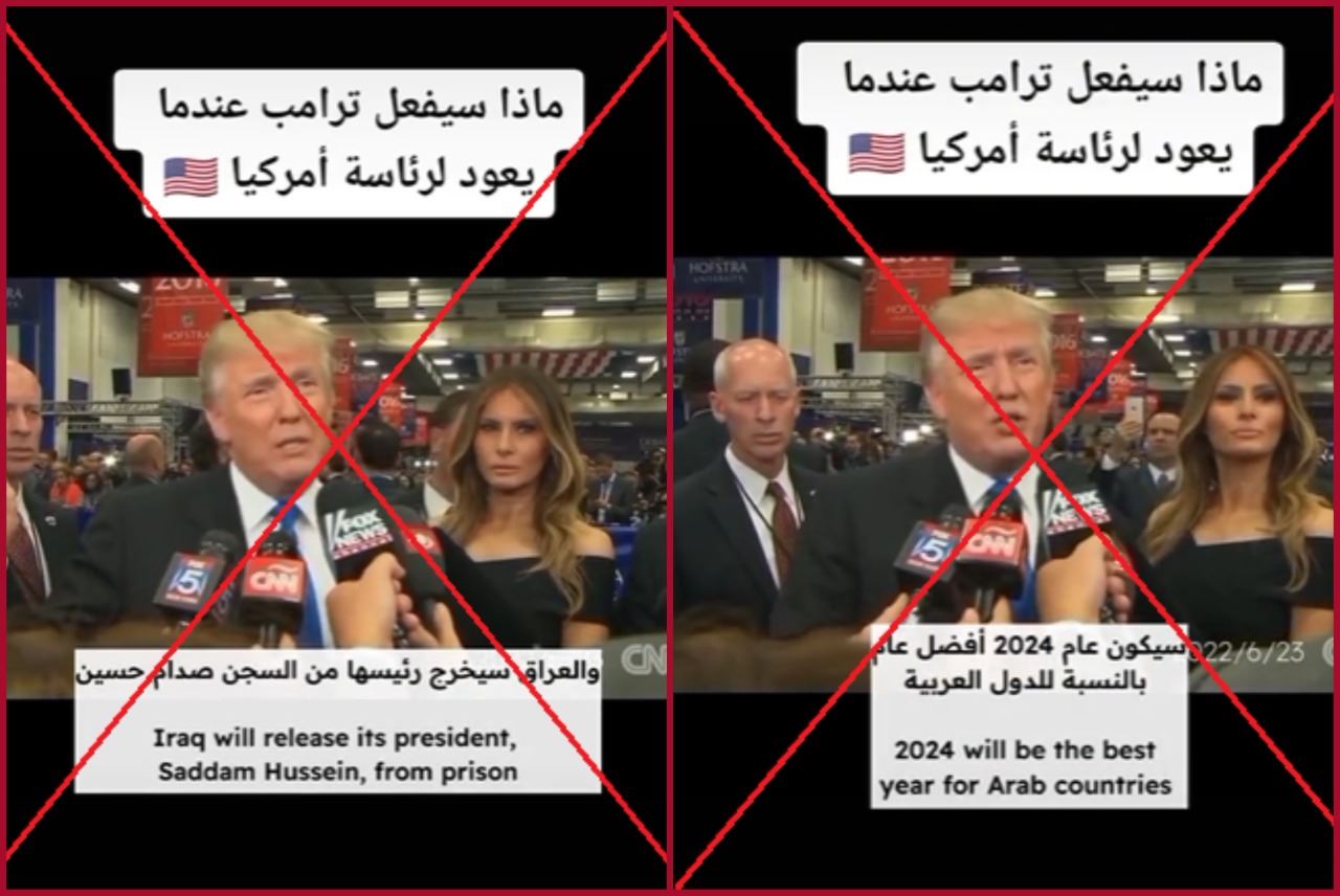 الرئيس الاميركي السابق دونالد ترامب مدليا بـ"وعود لسنة 2024". فيديو يتناقله مستخدمون لوسائل التواصل الاجتماعي بعنوان "ماذا سيفعل ترامب عندما يعود لرئاسة أميركا؟"، ويظهر فيه وهو يقول ان "فلسطين ستكون مستقلة"، و"سوريا ستعود أفضل من ذي قبل"، والعراق سيخرج الرئيس صدام حسين من السجن. صدام لم يُعدم...". غير أن هذا الفيديو تمّ التلاعب به رقميا عبر صوت مركّب، ليبدو ترامب أنه يقول ما يدلي به، بينما الفيديو الأصلي الذي يعود الى أيلول 2016، يظهر ترامب المرشح الجمهوري للرئاسة، وهو يبدي رأيه، شاكيا من الميكروفون، بعد المناظرة التلفزيونية مع منافسته الديموقراطية هيلاري كلينتون في جامعة هوفسترا بنيويورك. FactCheck#