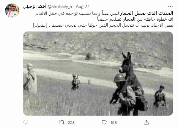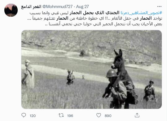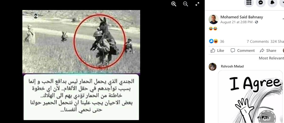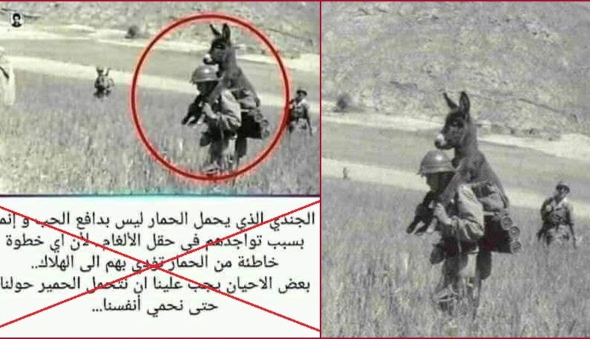 الوقائع: الصورة بالأبيض والأسود. ويظهر فيها شخص بلباس عسكري، على ما يبدو، حاملا حمارا على ظهره في حقل. وكان معه ثلاثة رجال آخرين. منذ ايام، تكثف التشارك في الصورة، عبر صفحات وحسابات، في الفايسبوك (هنا، هنا، هنا، هنا...)، وتويتر (هنا، هنا، هنا، هنا...). وقد أُرفقت بالمزاعم الآتية (من دون تدخل أو تصحيح): "الجندي الذي يحمل الحمار ليس بدافع الحب وإنما بسبب تواجدهم في حقل الألغام لأن أي خطوة خاطئة من الحمار تؤدي بهم إلى الهلاك. بعض الأحيان يجب علينا أن نتحمل الحمير حولنا حتى نحمي أنفسنا".