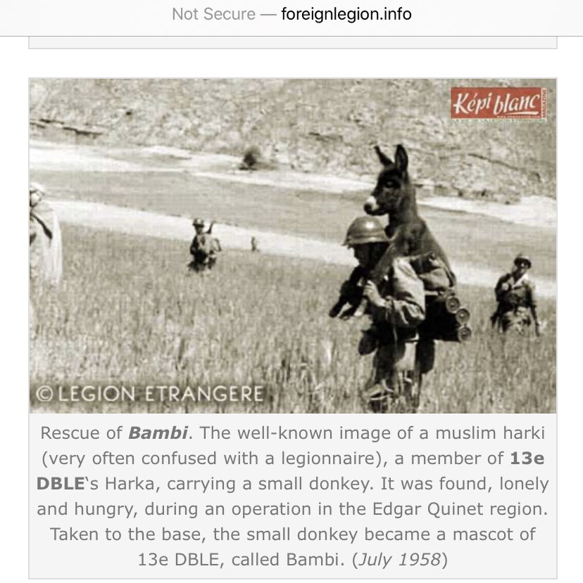 ونشر الموقع الصورة مرفقة بالشرح الآتي: "إنقاذ بامبي. صورة شهيرة لحركي مسلم (غالبًا ما يتم الخلط بينه وبين جندي في الفيلق)، عنصر في الحركة Harka التابعة للواء الثالث عشر من الفيلق الأجنبي، حاملاً حمارًا صغيرًا تمّ العثور عليه وحيدا وجائعا، خلال عملية في منطقة إدغار كوينيت Edgar Quinet. وقد أصبح الحمار الصغير، بعد أخذه إلى القاعدة، تميمة اللواء. وسمي بامبي Bambi (تموز 1958)".