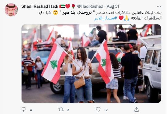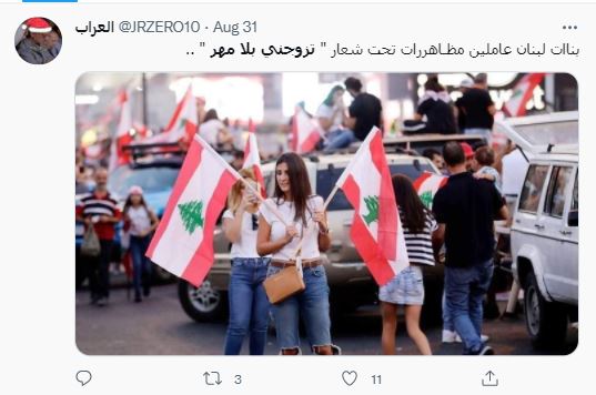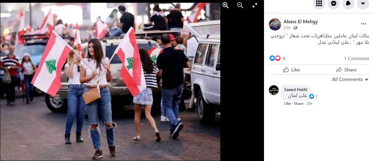 الوقائع: منذ ساعات، تكثّف التشارك في الصورة في حسابات وصفحات في الفايسبوك (هنا، هنا، هنا، هنا)، وتويتر (هنا، هنا، هنا...). ووفقا للمزاعم المتناقلة (من دون تدخل أوتصحيح)، فإن "بناات لبنان عاملين مظـاهررات تحت شعار "تزوجني بلا مهر". وفي الوقت ذاته، نشرت مواقع اخبارية عربية الصورة ضمن تقارير عن "اطلاق لبنانيات حملة في تويتر بشعار "تزوجني بدون مهر"، بسبب الظروف المعيشية الصعبة في البلاد (هنا، هنا، هنا، هنا، هنا...).