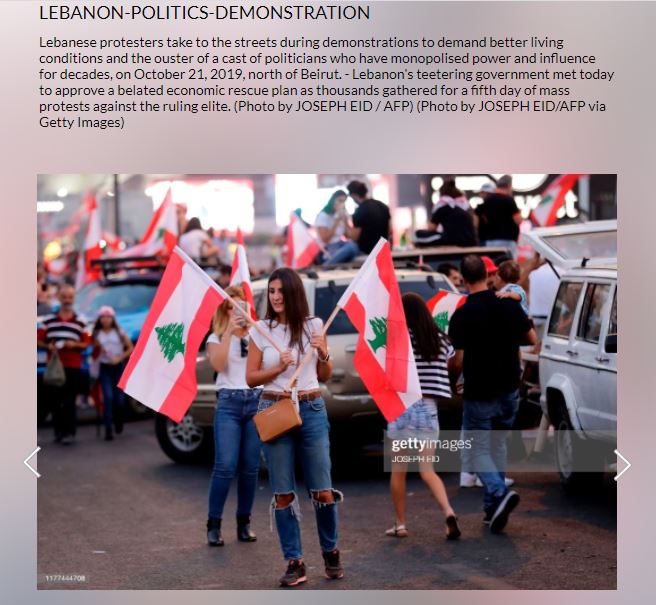 في 21 تشرين الأول 2019، "اجتمعت الحكومة اللبنانية للموافقة على خطة إنقاذ اقتصادية متأخرة، في وقت تجمع آلاف، لليوم الخامس على التوالي من احتجاجات شعبية ضد الطبقة الحاكمة"، وفقا لما أضافت غيتي ايماجيز.