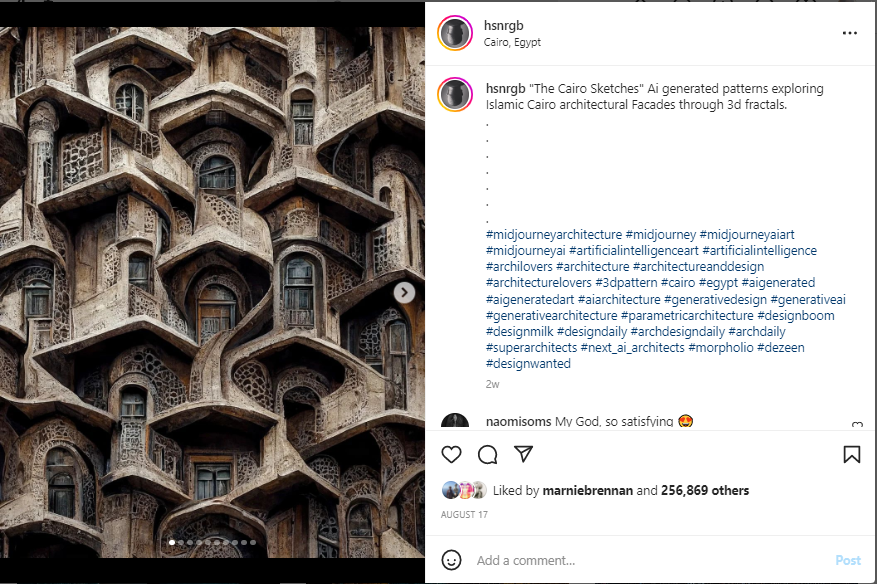 ويتضمن حساب رجب صورا عديدة لاماكن وعمارات باشكال هندسية رائعة وخيالية انجزها باستخدام الذكاء الاصطناعي (هنا، هنا، هنا...).