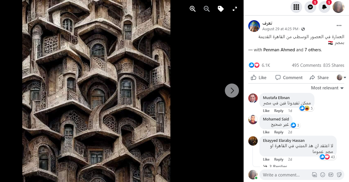 بناء آسر بهندسته وتكاوينه وتفاصيله. صورة يتداولها مستخدمون لوسائل التواصل الاجتماعي بمزاعم انها تظهر "عمارة من العصور الوسطى في القاهرة القديمة بمصر". غير أنّ هذا الزعم غير صحيح. في الواقع، العمارة في الصورة ليست حقيقية، لكونها عملا فنيا رقميا أنجزه الفنان المصري حسن رجب، ونشره في حسابه في انستغرام في 17 آب 2022. FactCheck#