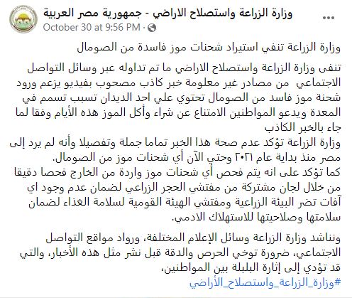 وأكدت الوزارة "عدم صحة هذا الخبر تماما جملة وتفصيلا، وأنه لم يرد إلى مصر منذ بداية عام 2021 وحتى الآن أي شحنات موز من الصومال". كذلك، أكدت انه "يتم فحص أي شحنات موز واردة من الخارج فحصا دقيقا من خلال لجان مشتركة من مفتشي الحجر الزراعي لضمان عدم وجود اي آفات تضر البيئة الزراعية ومفتشي الهيئة القومية لسلامة الغذاء لضمان سلامتها وصلاحيتها للاستهلاك الادمي".