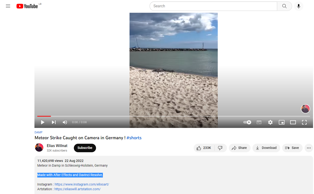 فالبحث عن الفيديو، بتجزئته الى مشاهد ثابتة (Invid)، يقودنا الى خيوط (هنا)، توصلنا الى مصدر الفيديو، الاختصاصي بصنع فيديوات بمؤثرات بصرية (VFX) إلياس ويلنات Elias Willnat، الذي نشر الفيديو في حسابه في يوتيوب في 22 آب 2022 (هنا)، بعنوان ضربة نيزك صوّرتها الكاميرا في ألمانيا.