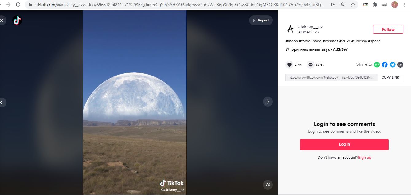 فالبحث عن الفيديو، بواسطة استخدام كلمات مفاتيح بالانكليزية مثل Moon وCGI، يُبزر فورا اسم الفنان الرقمي الاوكراني أليكسي باتريف Aleksey Patrev، الذي نشر الفيديو في حسابه في تيك توك  aleksey__nz@، في 17 أيار 2021.