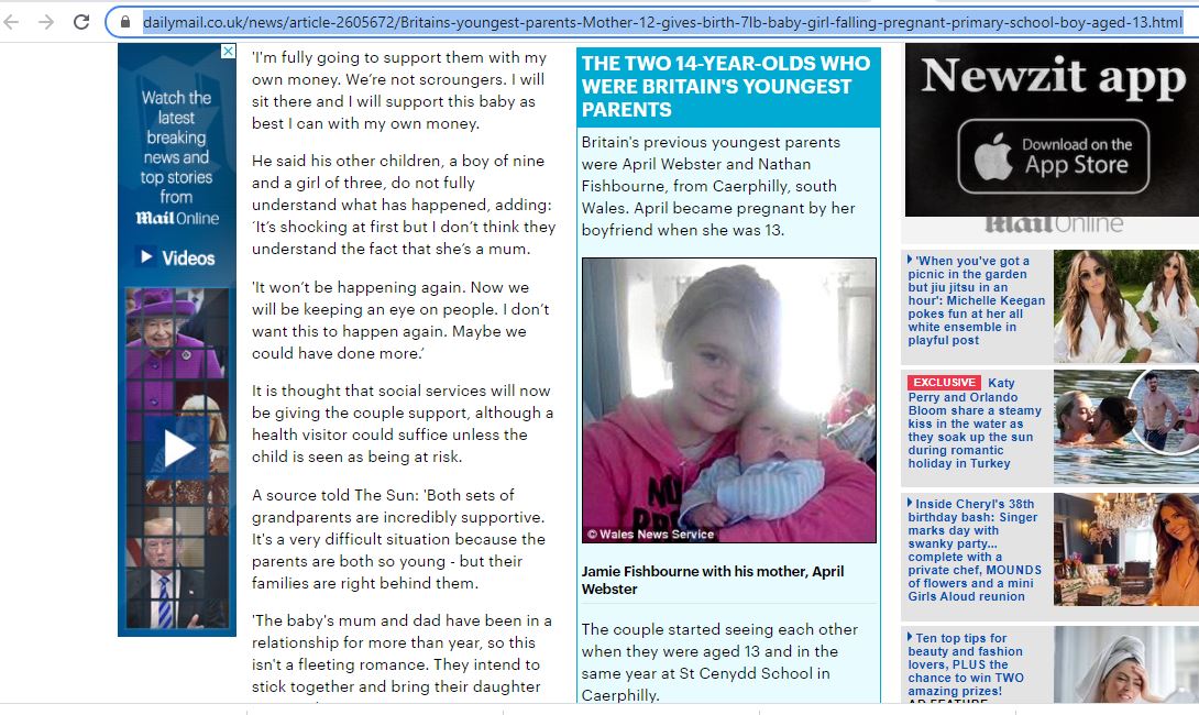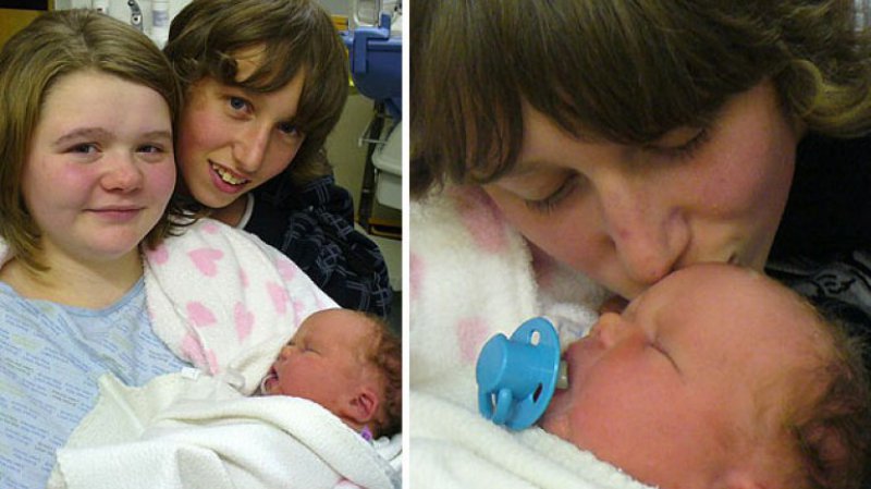 تظهر البريطانية أبريل ويبستر April Webster وصديقها ناثان فيشبورن، البالغين 14 عاما، من كيرفيلي جنوب ويلز، مع رضيعهما جايمي فيشبورن Jamie Fishbourne، الذي ولد في 15 ت2 2010، وفقا لما أورد موقع "ديلي مايل" البريطاني، مشيرا الى ان ابريل حبلت من ناثان عندما كانت في الثالثة عشرة من عمرها (هنا).