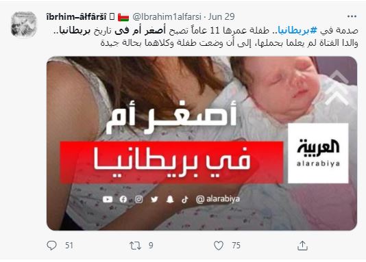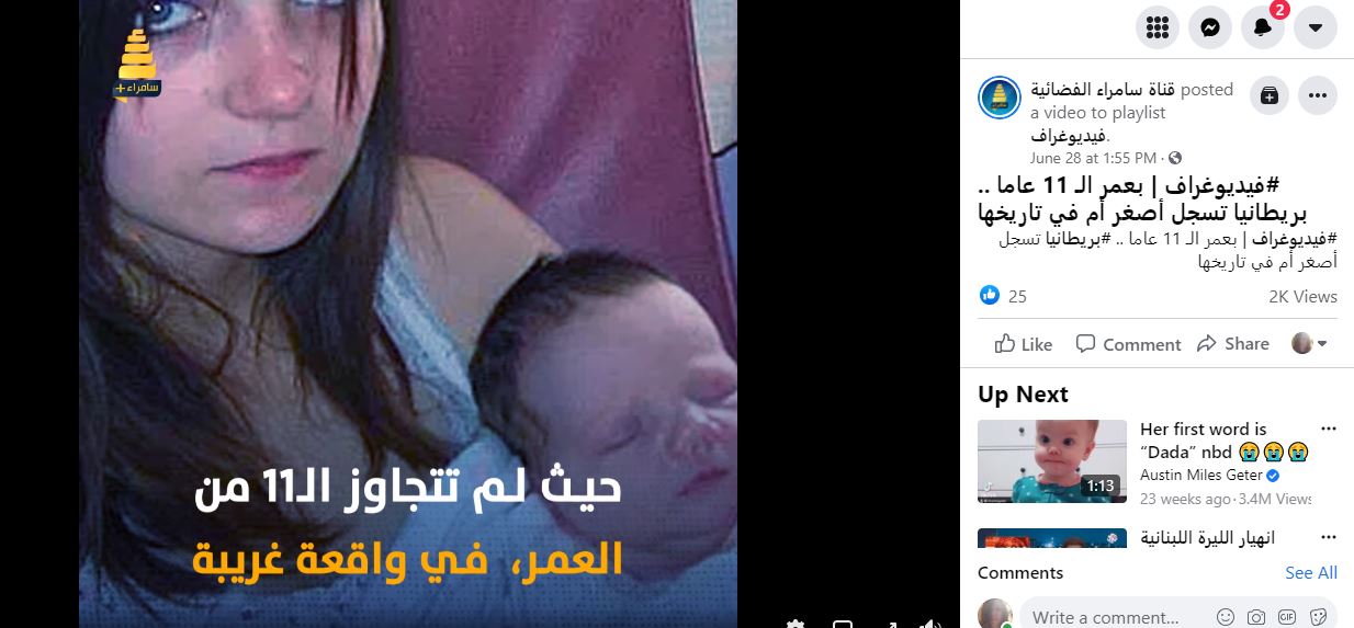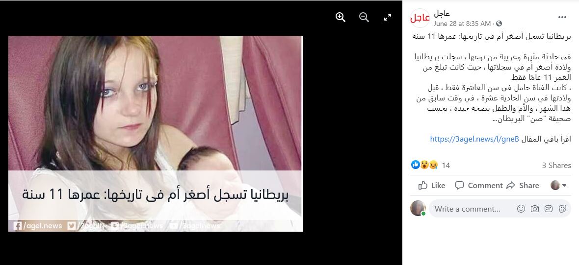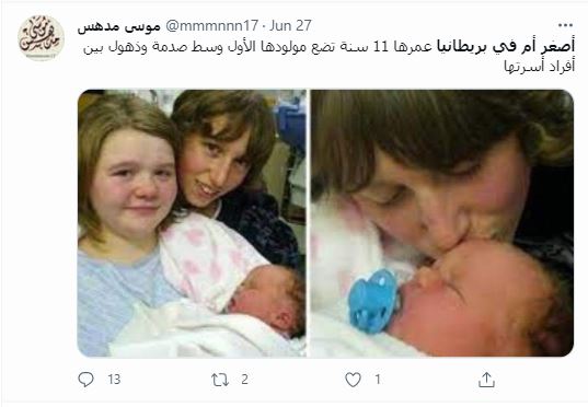 الوقائع: التشارك في الصور تكثف أخيرا، عبر صفحات وحسابات، في الفايسبوك (هنا، هنا، هنا...)، وتويتر (هنا، هنا، هنا، هنا، هنا، وهنا، هنا...)، وايضا عبر مواقع (هنا، هنا...). وقد أرفقت بالمزاعم الآتية (من دون تدخل أو تصحيح): "بريطانيا تسجل أصغر أم في تاريخها!"، و"الكشف عن أصغر أم في تاريخ بريطانيا بعد ولادة طفلها"، و"أصغر أم في بريطانيا طفلة تضع مولودها الأول في سن الحادية عشرة".