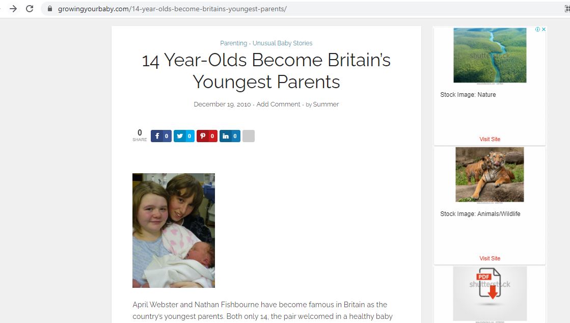 وقد أمكن ايجاد الصورة منشورة في مواقع عدة في كانون الاول 2010 (هنا، هنا، هنا، هنا...)، ضمن تقارير عن هذا الثنائي البالغ 14 عامًا، و"الذي أصبح أصغر أب وأم في بريطانيا"، يومذاك، وفقا لما وُصفا به (هنا ايضا).