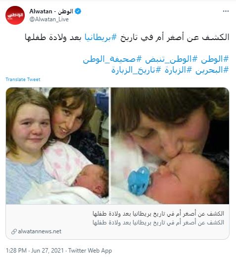 يتداول مستخدمون لوسائل التواصل الاجتماعي صورا عدة بمزاعم انها تظهر "أصغر أم في تاريخ بريطانيا". الا ان هذا الادعاء خاطئ. إحدى الصور تظهر الأم الأصغر السابقة البريطانية تريسا ميدلتون التي أنجبت طفلة عام 2006، وكانت تبلغ 12 عامًا، بينما تعود الصورتين الاخريين الى البريطانية أبريل ويبستر التي أنجبت ابنها جايمي عندما كانت تبلغ 14 عاما. FactCheck#