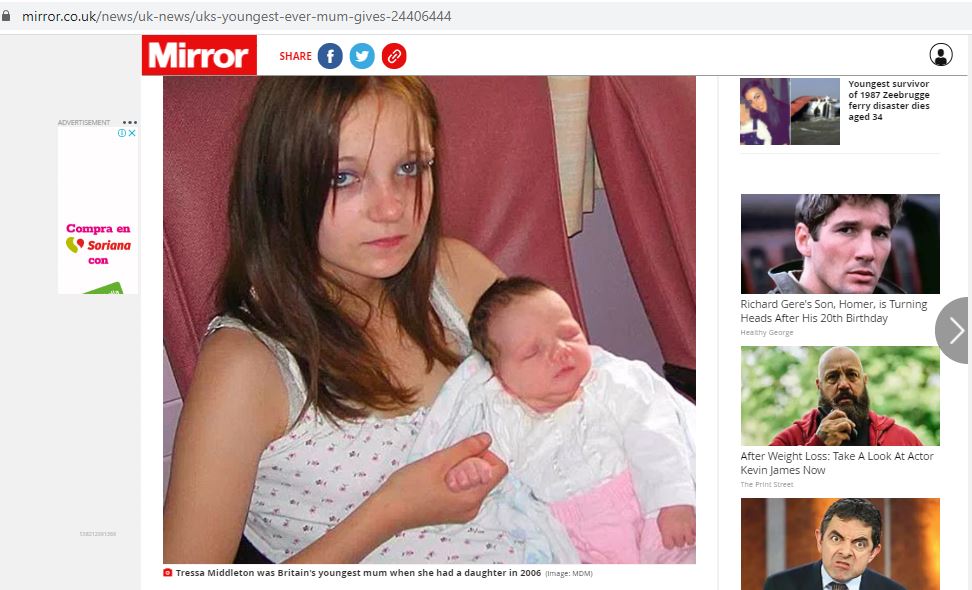 تظهر البريطانية تريسا ميدلتون Tressa Middleton، التي انجبت طفلة عندما كانت تبلغ 12 عاما، عام 2006. لكنها أُجبرت على التخلي عنها بعدما اعترفت أن "والد الطفل هو شقيقها جايسون الذي اغتصبها"، وفقا لما أورد موقع "ميرور" البريطاني. وقد أطلقت عليها وسائل الاعلام البريطانية يومذاك "اصغر أم في بريطانيا".