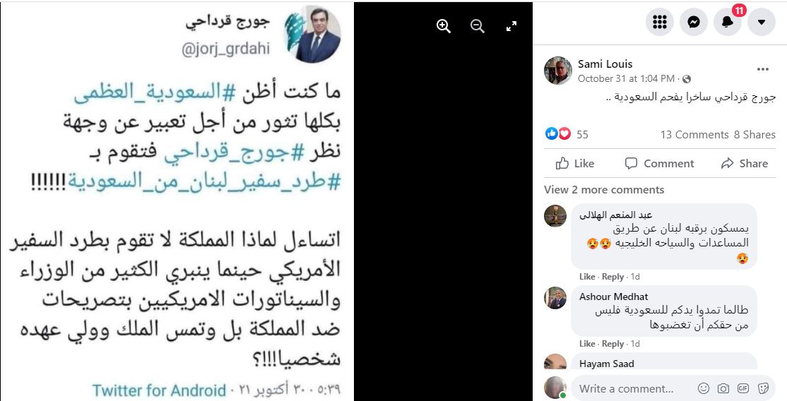 الوقائع: تغريدتان تحديدا تنتشران بكثافة في حسابات وصفحات، في الفايسبوك (هنا، هنا، هنا...) وتويتر (هنا، هنا، هنا...)، حاصدتين تفاعلا بين مستخدمين لوسائل التواصل. وجاء في الأولى (من دون تدخل): "ما كنت أظن السعودية العظمى بكلها تثور من أجل تعبير عن وجهة نظر جورج قرداحي، فتقوم بطرد سفير لبنان في السعودية...". وفي الاخرى، "شكرا للشعب اليمن العظيم... شكرا لكل من تضامن معنا...".