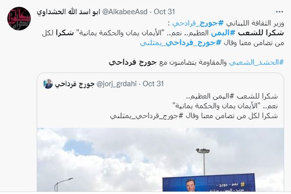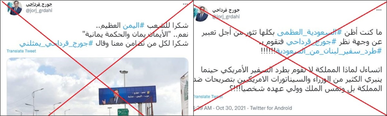 لكنّ هاتين التغريدتين لم ينشرهما في الحقيقة وزير الاعلام اللبناني جورج قرداحي.
