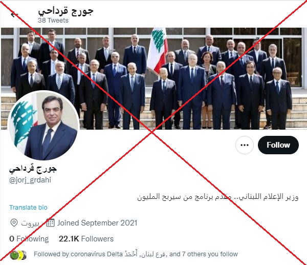 في الواقع، لدى وزير الاعلام اللبناني جورج قرداحي حساب رسمي في تويتر، يعبّر فيه عن مواقفه. وعنوانه GKordahi@، والاسم مكتوب بالاجنبية: George Kordahi. وقد انشىء في آذار 2013، وفقا لما هو مذكور فيه.