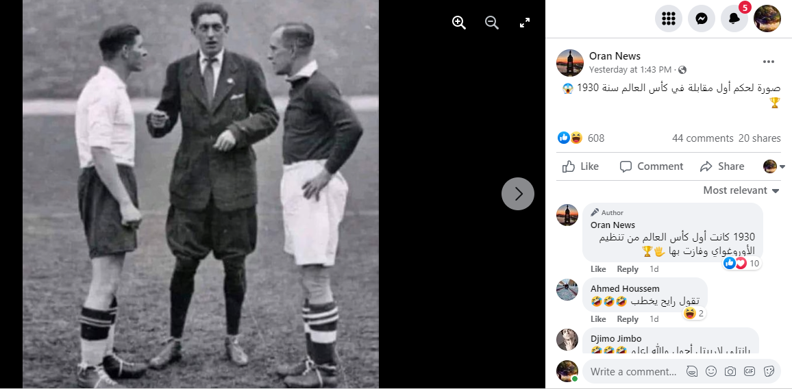 الوقائع: ثلاثة رجال في الصورة، اثنان منهما بثياب رياضية. منذ ايام قليلة، تكثف التشارك فيها عبر صفحات وحسابات (هنا، هنا، هنا، هنا...)، مرفقة بمزاعم انها "صور لأول لحكم أول مباراة في كأس العالم عام 1930".