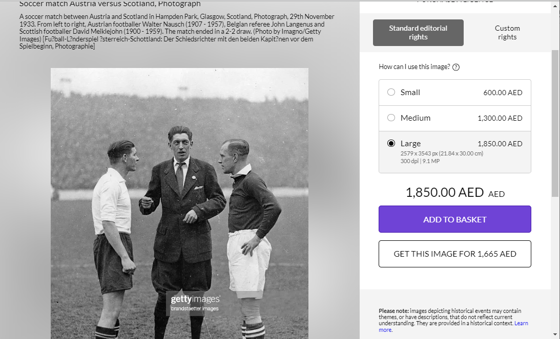 فالبحث العكسي عنها يوصلنا الى موقع وكالة Getty Images الذي نشرها (هنا) بعنوان: "مباراة كرة القدم بين النمسا واسكتلندا". وشرح ان الصورة تعود الى "مباراة كرة قدم بين النمسا واسكتلندا في هامبدن بارك بغلاسكو في اسكتلندا في 29 تشرين الثاني 1933".