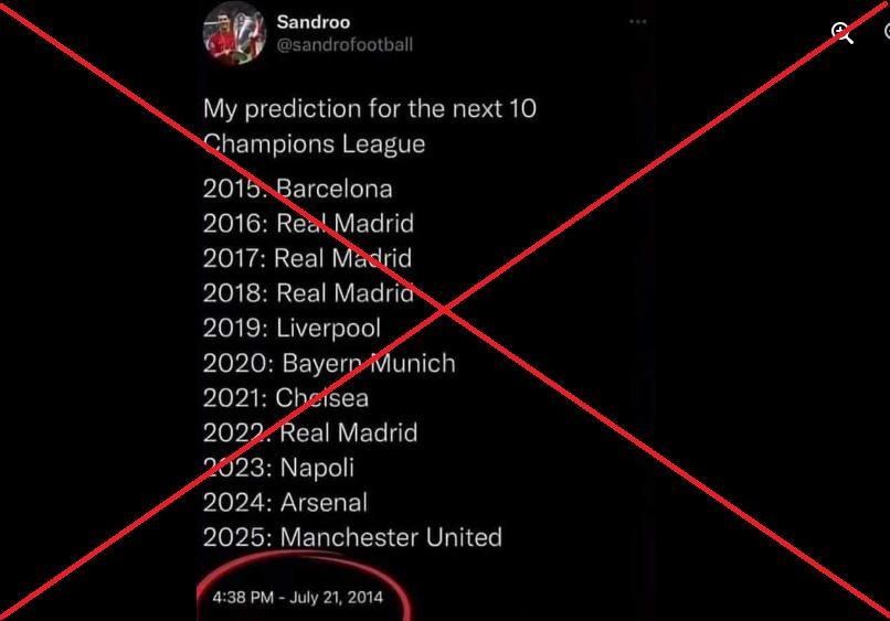 تداول مستخدمون لمواقع التواصل الاجتماعي صورة ادّعى ناشروها أنّها لتغريدة من العام 2014 توقّعت بنجاحٍ أسماء الأندية الفائزة في دوري أبطال أوروبا لكرة القدم بين عامي 2015 و2022. إلا أنّ الصورة في الحقيقة مركّبة.
