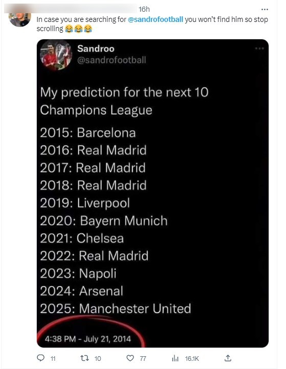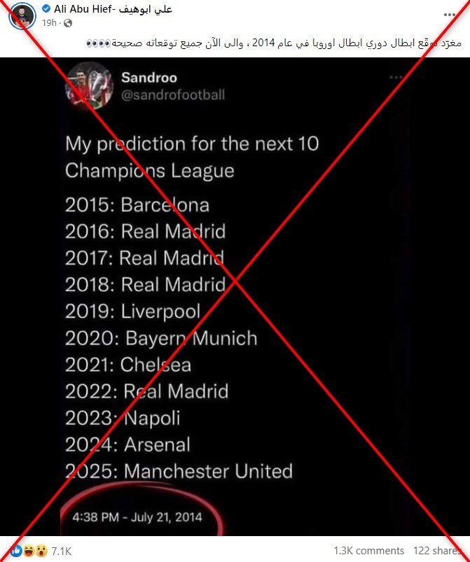 يتضمّن المنشور صورة لما يبدو أنّها تغريدة يعود تاريخها لعام 2014 تضمّنت توقعات بأسماء الأندية التي ستفوز بدوري أبطال أوروبا لكرة القدم بين عامي 2015 و2025.