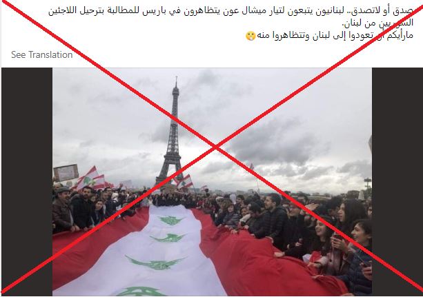 الصورة تظهر اشخاصا تحلقوا حول علم لبناني كبير، بينما حمل بعضهم اعلاما لبنانية صغيرة ولافتات. وبدا في الخلفية برج ايفل. وقد تكثّف التشارك فيها أخيرا، عبر حسابات، أرفقتها بالمزاعم الآتية (من دون تدخل او تصحيح): "صدق أو لا تصدق... لبنانيون يتبعون لتيار ميشال عون يتظاهرون في باريس للمطالبة بترحيل اللاجئين السوريين من لبنان ما رأيكم أن تعودوا إلى لبنان وتتظاهروا منه".