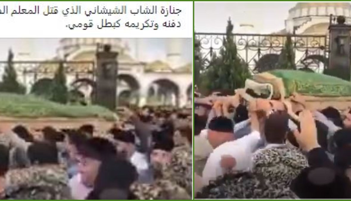 الوقائع: المكان غصّ بالمشيعين. وقد شق النعش طريقه بينهم، على وقع التكبير. التشارك في المقطع على قدم وساق، لا سيما في الفيسبوك (مثل هنا، هنا، هنا، هنا...)، وتويتر (هنا، هنا، هنا...)، ويوتيوب (هنا، هنا...). وقد أرفق بالمزاعم الآتية (من دون تدخل أو تصحيح): "جنازة الشاب الشيشاني الذي قتل المعلم الفرنسي نقلت الى الشيشان وتم دفنه وتكريمه كبطل قومي".