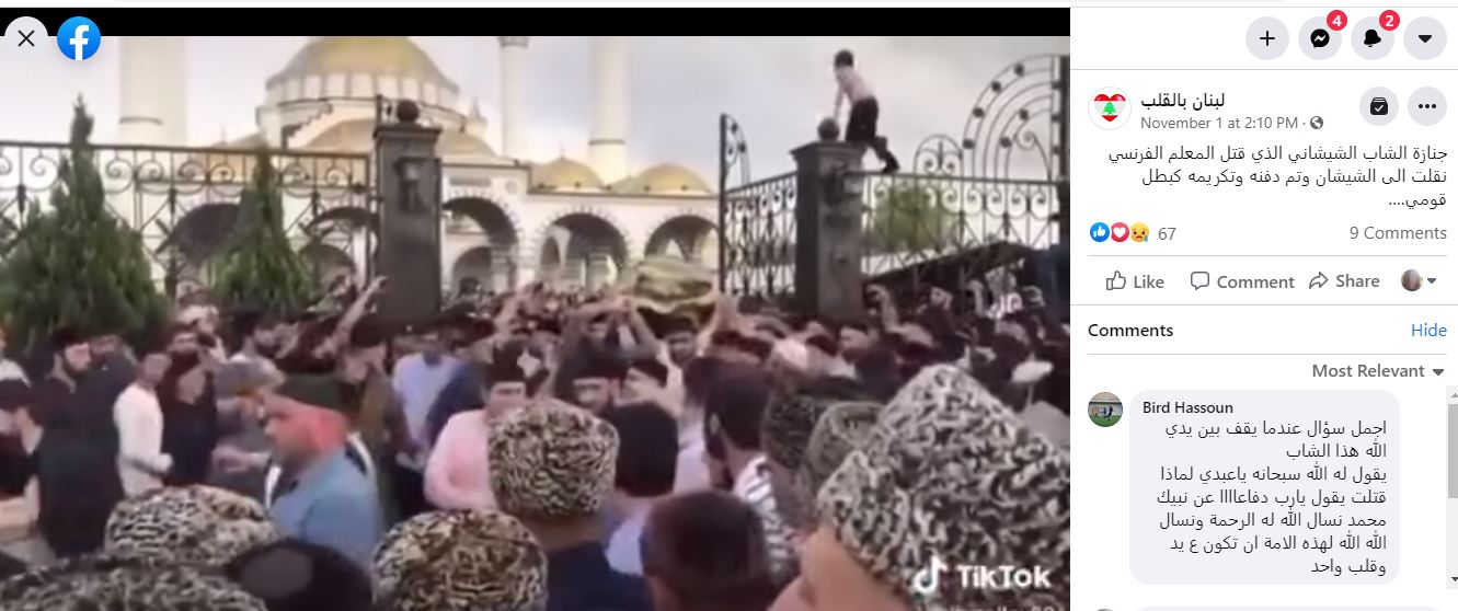 يتناقل مستخدمون لوسائل التواصل الاجتماعي مقطع فيديو بمزاعم انه يعود لـ"جنازة الشاب الشيشاني الذي قتل المعلم الفرنسي، وقد نقل الى الشيشان وتم دفنه وتكريمه كبطل قومي". غير أن هذه المزاعم لا صحة لها. الفيديو قديم، اذ يعود الى 4 آب 2018، ويظهر تشييع يوسف تيميرخانوف، وهو شيشاني حكم عليه بالسجن 15 عاما لقتله العقيد السابق في الجيش الروسي يوري بودانوف. FactCheck#