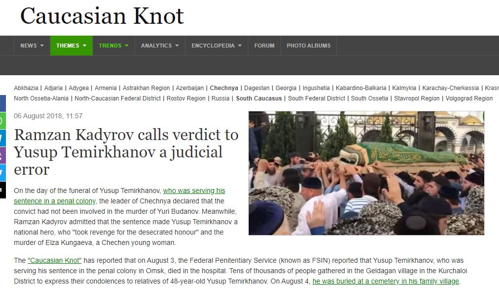 يوسف تيميرخانوف Yusup Temirkhanov شيشاني حكم عليه بالسجن 15 عاما لقتله العقيد السابق في الجيش الروسي يوري بودانوف. وتوفي في مستشفى السجن في 3 آب 2018، اثر إصابته بأزمة قلبية.
