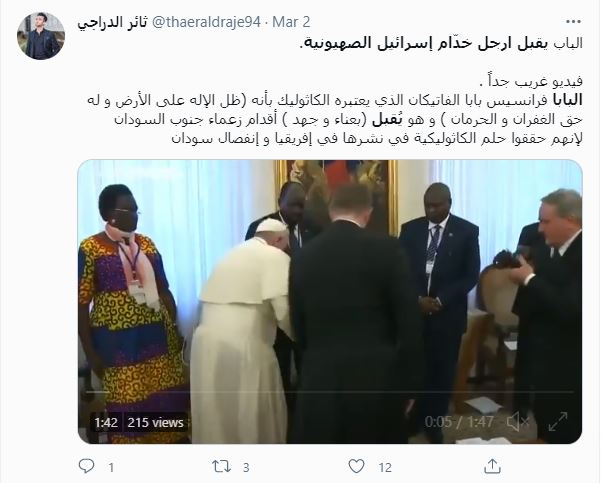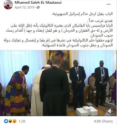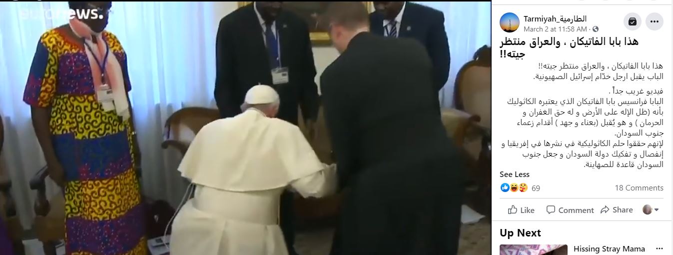الوقائع: 1,47 دقيقة مدة الفيديو. المشاهد تظهر البابا فرنسيس راكعا ليقبل أرجل اشخاص كانوا واقفين في غرفة. منذ ساعات، تكثف التشارك في الفيديو، عبر صفحات وحسابات، خصوصا عراقية، في الفيسبوك (هنا، هنا، هنا، هنا، هنا، هنا...)، وتويتر (هنا، هنا، هنا...). وقد أرفق بالمزاعم الآتية (من دون تدخل أو تصحيح): "هذا بابا الفاتيكان، والعراق منتظر جيته. البابا يقبل ارجل خدّام إسرائيل الصهيونية. فيديو غريب جداً . البابا فرانسيس بابا الفاتيكان الذي يعتبره الكاثوليك بأنه (ظل الإله على الأرض وله حق الغفران و الحرمان) وهو يُقبل (بعناء و جهد) أقدام زعماء جنوب السودان. لإنهم حققوا حلم الكاثوليكية في نشرها في إفريقيا وإنفصال وتفكيك دولة السودان وجعل جنوب السودان قاعدة للصهاينة".