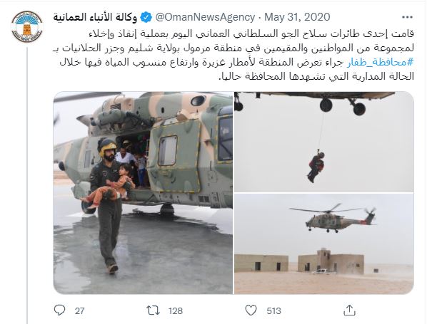 لكن البحث العكسي عن الصورة، بواسطة مختلف محركات البحث، يبين ان الصورة التقطت في سلطنة عمان، لكنها قديمة، بحيث ترجع الى 31 ايار 2020. وقد نشرتها حسابات وصفحات ومواقع اخبارية، لا سيما عُمانية (هنا، هنا، هنا، هنا، هنا، هنا...)، مع شرح ان "إحدى طائرات سلاح الجو السلطاني العماني أجرت اليوم عملية إنقاذ وإخلاء لمجموعة من المواطنين والمقيمين في منطقة مرمول بولاية شليم وجزر الحلانيات بمحافظة ظفار من جراء تعرض المنطقة لأمطار غزيرة وارتفاع منسوب المياه فيها خلال الحالة المدارية التي تشهدها المحافظة حاليا"، وفقا لما أوردت وكالة الانباء العمانية (هنا، هنا).