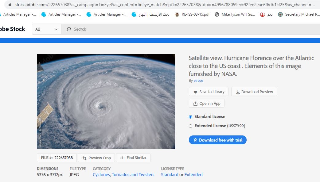 تنتشر في وسائل التواصل الاجتماعي بمزاعم انها "صورة من الفضاء للاعصار شاهين" (هنا، هنا...). لكن البحث العكسي عنها يبين ان لا علاقة لها بالاعصار شاهين، بل تعود الى 12 ايلول 2018، وتظهر الاعصار فلورانس فوق المحيط الأطلسي بالقرب من الساحل الأميركي (هنا، هنا، هنا)، المصدر وكالة الفضاء الاميركية (ناسا).