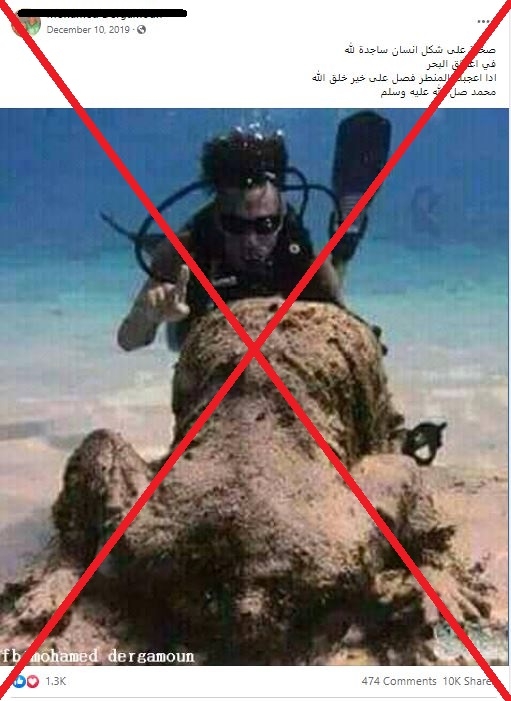 آلاف المشاركات ومئات التعليقات حصدتها صورة على مواقع التواصل الاجتماعي خلال سنوات، ادعى ناشروها أنها لـ"صخرة في شكل إنسان يصلّي ويسجد لله في أعماق البحر". إلا أن الادعاء غير صحيح، فالصورة تعود لواحدة من مجموعة منحوتات في منتزه مائيّ في المكسيك.
