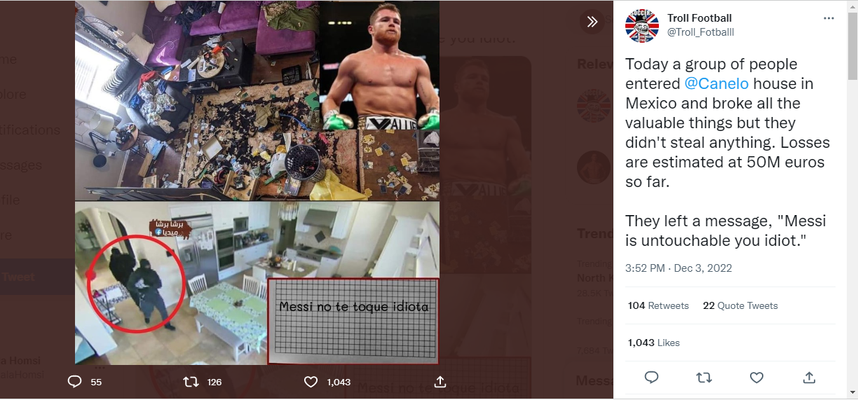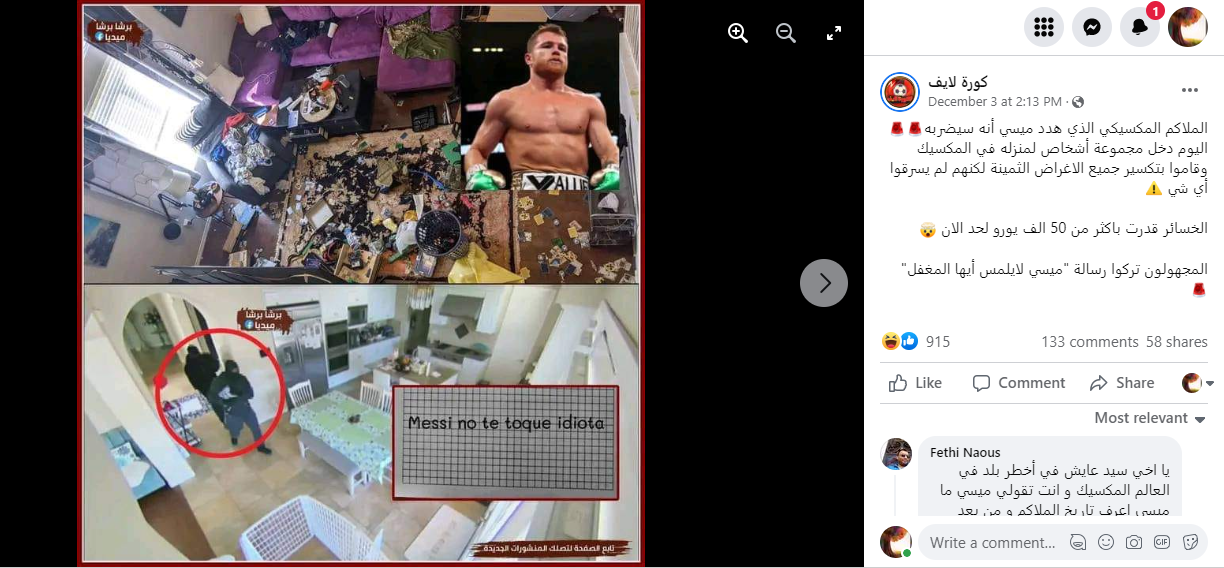 الوقائع: تظهر الصورة العليا اضرارا في غرفة جلوس على ما يبدو، بينما ظهر رجلان مقنعان في الصورة السفلى، وكانا يدخلان مطبخا. منذ ايام قليلة، تكثف التشارك في الصورتين، عبر حسابات، عربية وأجنبية (هنا، هنا، هنا، هنا، هنا، هنا...). وقد أرفقتا بالمزاعم الآتية (من دون تدخل او تصحيح): "الملاكم المكسيكي الذي هدد ميسي بضربه اليوم دخل مجموعة أشخاص لمنزله في المكسيك وقاموا بتكسير جميع الاغراض الثمينة لكنهم لم يسرقوا أي شي. الخسائر قدرت باكثر من 50 الف يورو لحد الان! المجهولون تركوا رسالة "ميسي لا يلمس أيها المغفل".