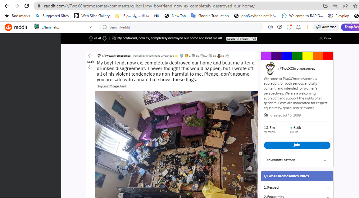 فالبحث العكسي عن الصورة العليا يقودنا، بواسطة محرك Tineye، الى حساب في موقع Reddit (هنا، هنا) نشرها في 4 تشرين الاول 2021، اي قبل اكثر من عام، مرفقة بالتعليق الآتي: "حبيبي السابق دمّر منزلنا تمامًا وضربني بعد خلاف فيما كان مخمورا. لم أكن أتصور أن هذا سيحدث، لكنني تجاهلت كل ميوله العنيفة بكونها غير ضارة بي. من فضلك، لا تفترضي أنك بأمان مع رجل يظهر هذه العلامات".