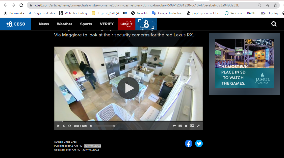 يبيّن البحث العكسي عن الصورة السفلى انها لقطة من فيديو نشرته مواقع اخبارية، لا سيما اميركية، في 18- 19 تموز 2022 (هنا، هنا، هنا، هنا، هنا...)، ضمن تقرير عن "تعرض منازل عدة في حي رولينغ هيلز رانش في تشولا فيستا (بمنطقة سان دييغو جنوب كاليفورنيا الاميركية) للسرقة".