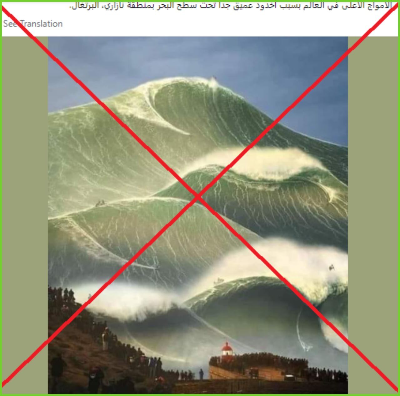 أمواج باهرة، طبقات فوق طبقات، شاهقة، على مرأى من أشخاص تجمعوا في المكان، وفقا لما تظهره الصورة. وقد تكثف التشارك فيها أخيرا، عبر حسابات (هنا، هنا، هنا، هنا...) ارفقتها بالمزاعم الآتية (من دون تدخل او تصحيح): "الأمواج الأعلى في العالم بسبب أخدود عميق جدا تحت سطح البحر بمنطقة نازاري، البرتغال".
