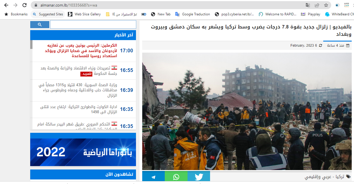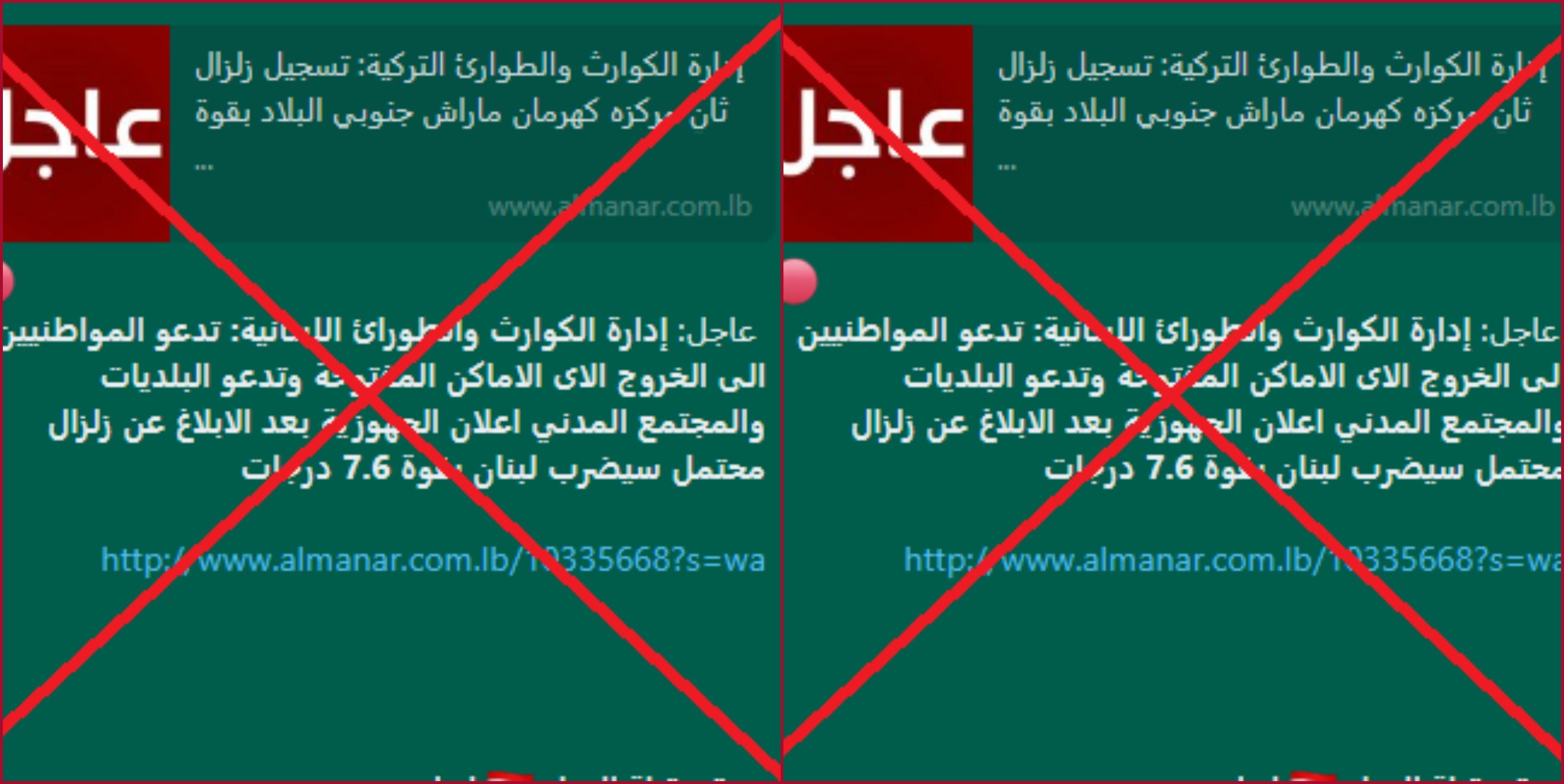 نقطة أخرى: الرابط المرفق بالخبر المتداول يقود الى تقرير نشره موقع "المنار" الاثنين بعنوان "زلزال جديد بقوة 7.8 درجات يضرب وسط تركيا ويشعر به سكان دمشق وبيروت وبغداد"، وليس الى الخبر المنسوب الى ما سمّي "إدارة الكوارث والطورائ اللبنانية".
