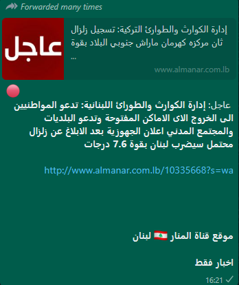 التشارك في الخبر تكثف، خصوصا عبر الواتساب، في الساعات الماضية. وجاء فيه (من دون تدخل او تصحيح): "عاجل: إدارة الكوارث والطورائ اللبنانية: تدعو المواطنيين الى الخروج الاى الاماكن المفتوحة وتدعو البلديات والمجتمع المدني اعلان الجهوزية بعد الابلاغ عن زلزال محتمل سيضرب لبنان بقوة 7.6 درجات".