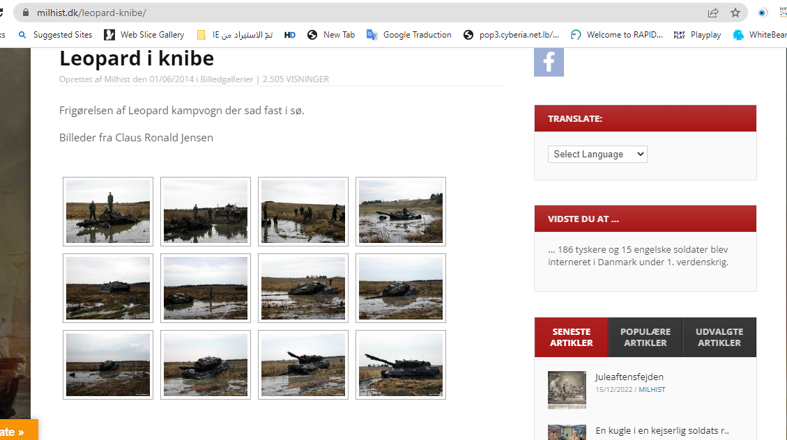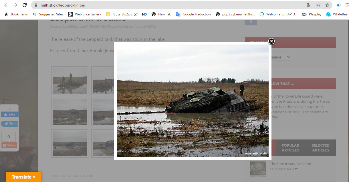 وفي الوقت ذاته، أمكن العثور عليها في موقع DANSK MILITÆRHISTORIE (هنا) المتخصص بالتاريخ العسكري الدانماركي، منشورة في 1 حزيران 2014، بعنوان: Leopard i knibe اي (دبابة) ليوبارد في ورطة، من تصوير كلاوس رونالد جنسن Claus Ronald Jensen.