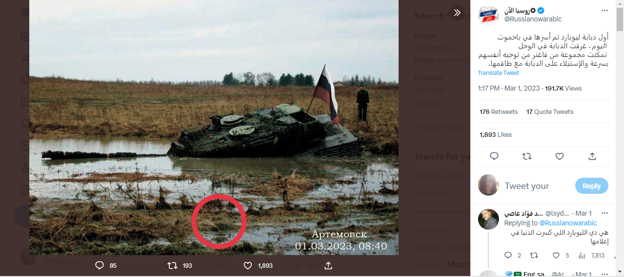 الصورة تظهر دبابة غارقة في مستنقع، على ما يبدو، وقد رفع عليها العلم الروسي. وقد أرّخت أسفلها بتاريخ 01.03.2023، الساعة 08:40، اضافة الى عبارة Артемовск بالروسية (تُعرف ايضا باسم باخموت). وقد تكثّف التشارك فيها أخيرا، عبر حسابات (هنا، هنا، هنا، هنا، هنا، هنا...)، أرفقتها بالمزاعم الآتية (من دون تدخل او تصحيح): "أول دبابة ليوبارد تم أسرها في باخموت اليوم، غرقت الدبابة في الوحل وتمكنت مجموعة من فاغنر من توجيه أنفسهم بسرعة والإستيلاء على الدبابة مع طاقمها".