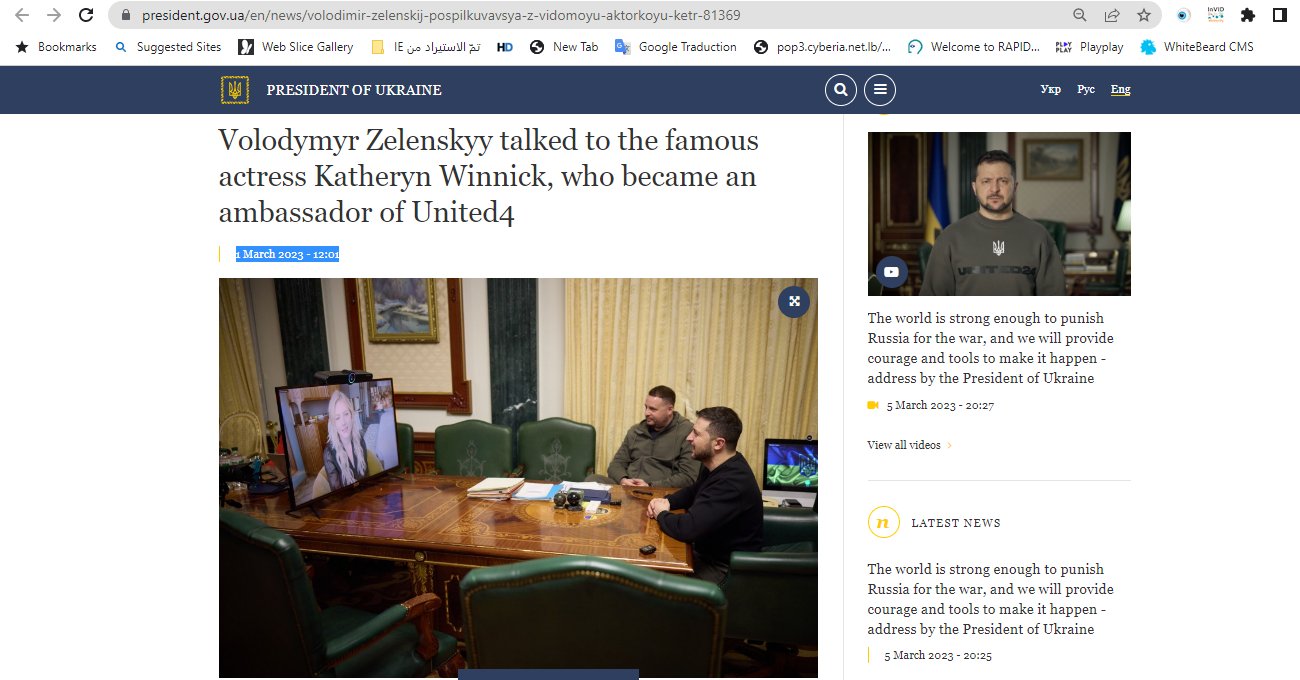 فالبحث العكسي عنها يضعنا فورا امام الصورة الاصلية منشورة في موقع الرئاسة الاوكرانية في 1 آذار 2023 (هنا)، ضمن خبر وزعته عن "لقاء زيلينسكي بالممثلة الشهيرة كاثرين وينيك Katheryn Winnick، التي أصبحت سفيرة يونايتد 4"، على ما جاء في العنوان.
