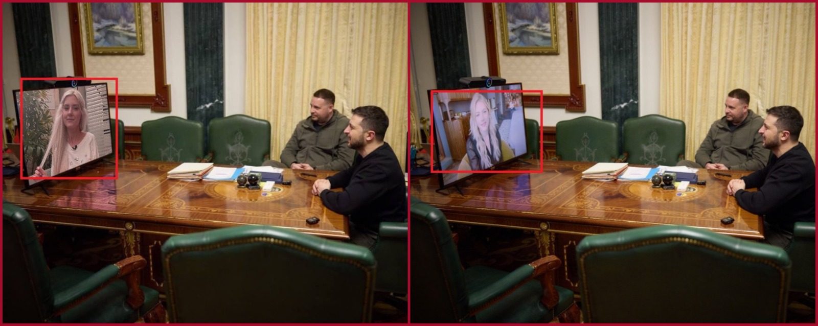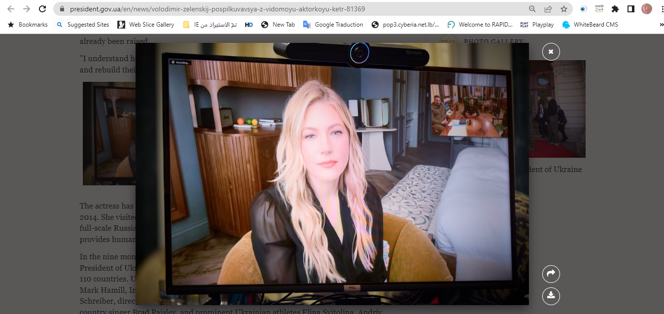 في الخبر الذي نشرته الرئاسة الاوكرانية مع الصورة الأصلية، جاء ان "الرئيس زيلينسكي اجرى مكالمة فيديو بنجمة الفايكنغ الممثلة الكندية من أصل أوكراني، المخرجة والمنتجة كاثرين وينيك Katheryn Winnick، التي انضمت إلى سفراء منصة جمع التبرعات United24.