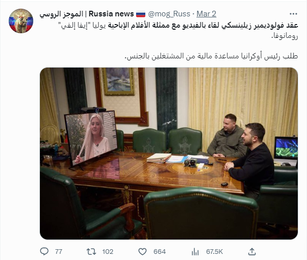 تظهر الصورة الرئيس الأوكراني فولوديمير زيلينسكي قبالة شاشة أطلت عبرها سيّدة. وقد تكثف التشارك فيها أخيرا، عبر حسابات (هنا، هنا، هنا، هنا، هنا، هنا، هنا...)، أرفقتها بالمزاعم الآتية (من دون تدخل او تصحيح): "عقد فولوديمير زيلينسكي لقاء بالفيديو مع ممثلة الأفلام الإباحية يوليا "إيفا إلفي" رومانوفا. طلب رئيس أوكرانيا مساعدة مالية من المشتغلين بالجنس".