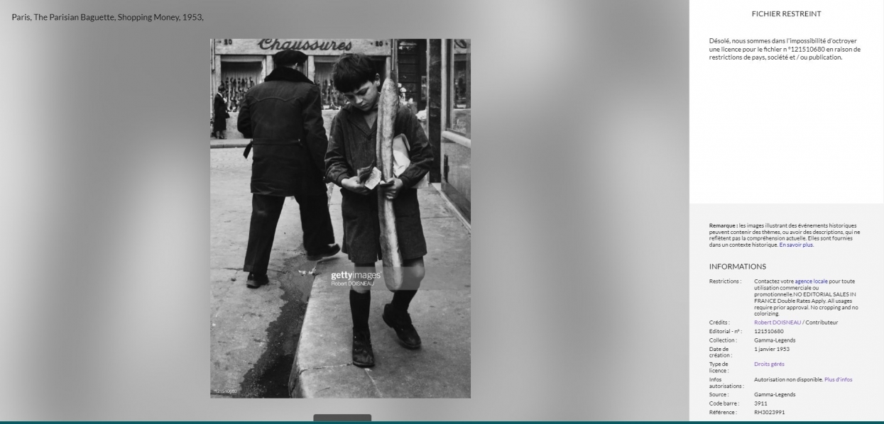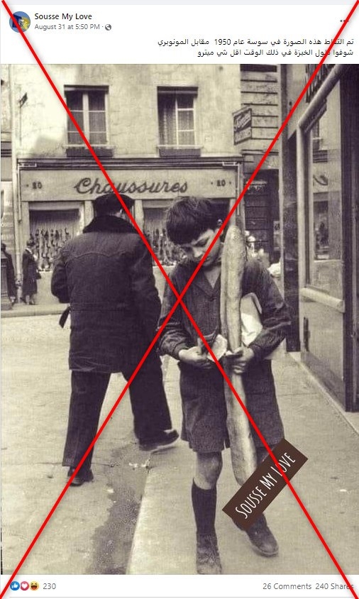 يتداول مستخدمون لمواقع التواصل الاجتماعي صورة ادّعى ناشروها أنّها تظهر صبياً يحمل الخبز في مدينة سوسة التونسيّة عام 1950. إلا أنّ الصورة في الحقيقة ملتقطة في باريس عام 1953.