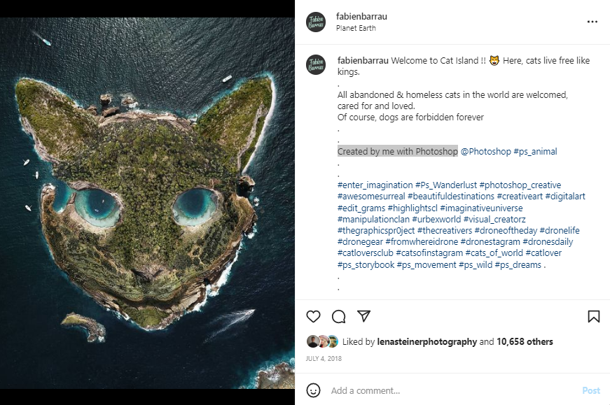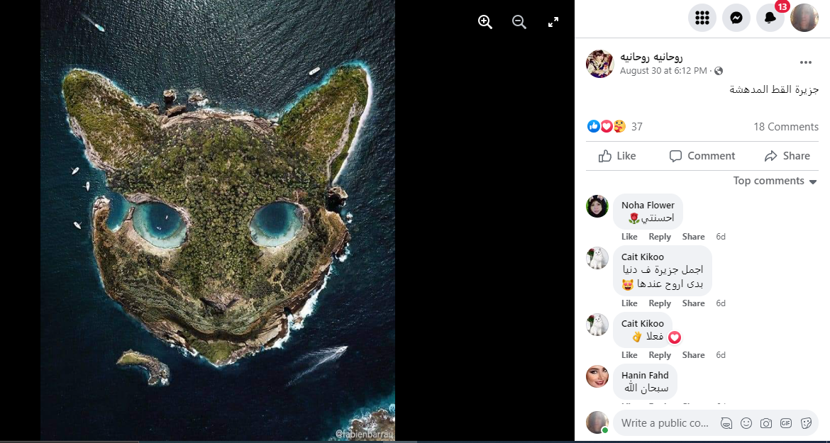 جزيرة "مدهشة" في شكل قط. صورة يتناقلها مستخدمون لوسائل التواصل الاجتماعي، بمزاعم ان "موقعها في إيسلندا"، وانها "لقضاء العطلة". غير أنّ هذا الزعم خاطئ. في الواقع، المشهد في الصورة ليس حقيقيا، لكونه انجز باستخدام برنامج لتعديل الصور (فوتوشوب)، بإقرار من صاحب الصورة، الفنان الرقمي فابيان بارو. وقد نشر صورته تلك في 4 تموز 2018 في حسابه في انستغرام. FactCheck#