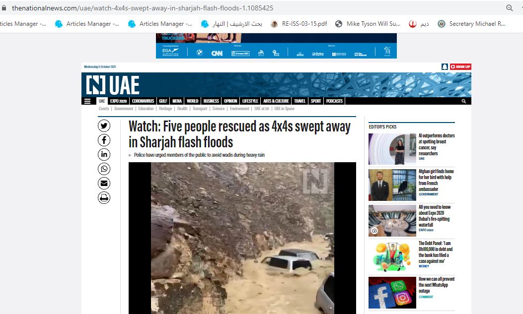 وأورد موقع The National News مع الفيديو انه "تم إنقاذ خمسة أشخاص بعدما جرفت فيضانات مفاجئة في الشارقة أربع سيارات، يوم الاثنين (28 ايلول 2020)، بعد هطول أمطار غزيرة على الإمارات الشمالية".