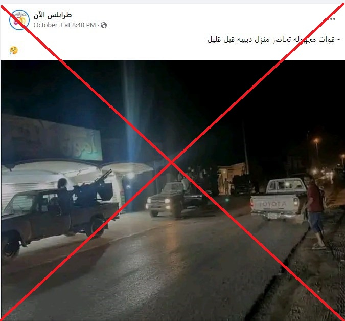 ظهرت على صفحات وحسابات على مواقع التواصل الاجتماعي، لا سيّما في ليبيا، صورة قيل إنها تُظهر قوّة مسلّحة تُحاصر في اليومين الماضيين بيت رئيس حكومة الوحدة الوطنية في طرابلس عبد الحميد الدبيبة، الذي تتنافس حكومته مع حكومة فتحي باشاغا في الشرق. لكن هذا الادعاء غير صحيح، والصورة منشورة في الحقيقة قبل أشهر.