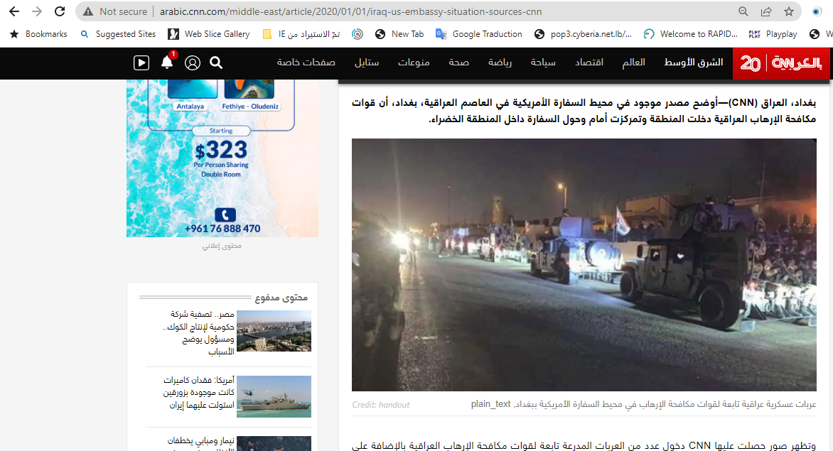 وقد نشر موقع "سي أن أن" الصورة في تقرير في 1 كانون الثاني 2020 (هنا)، وتظهر "دخول عدد من العربات المدرّعة التابعة لقوات مكافحة الإرهاب العراقية، إضافة الى سيارات عسكرية من نوع همفي"، المنطقة لتتمركز أمام السفارة الاميركية وحولها وداخل المنطقة الخضراء في بغداد، وذلك وفقا لما نقل عن مصدر موجود في محيط السفارة.