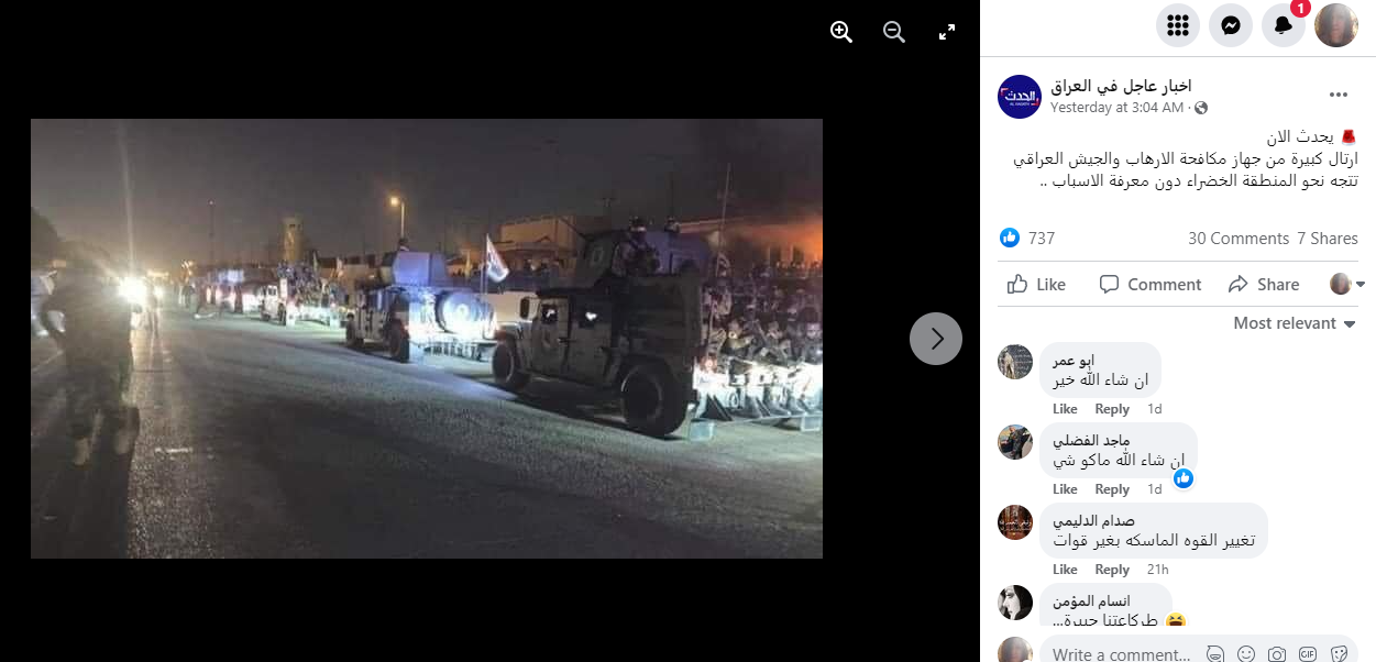 الوقائع: صورة ليلية تظهر آليات عسكرية على طريق. وقد تكثف التشارك فيها في الساعات الماضية، عبر صفحات وحسابات في الفايسبوك (هنا، هنا، هنا، هنا، هنا، هنا...)، وتويتر (هنا، هنا، هنا...). وقد أرفقت بالمزاعم الآتية (من دون تدخل او تصحيح): "يحدث الان ارتال كبيرة من جهاز مكافحة الارهاب والجيش العراقي تتجه نحو المنطقة الخضراء دون معرفة الاسباب".