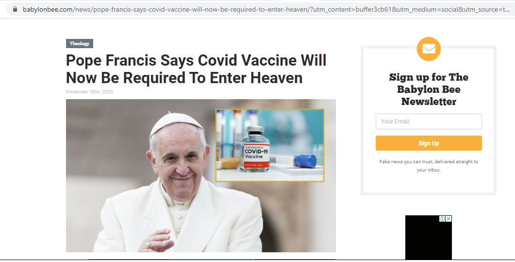 يتناقل مستخدمون لوسائل التواصل الاجتماعي تصريحا منسوبا الى البابا فرنسيس بأن تلقي "اللقاح ضد كوفيد-19 سيكون ابتداء من اليوم ضروريا لدخول الجنة". وقد أرفق بمقالة بالانكليزية كدليل على صحة هذه المزاعم. غير أن هذا التصريح لا صحة له، من نسج الخيال، ذلك أن مصدره هو موقع The Babylon Bee الساخر. FactCheck#
